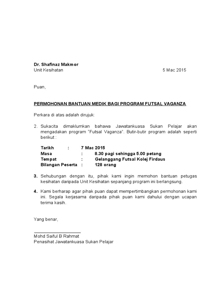 Contoh Surat Rasmi Permohonan Bantuan - Untuk kamu yang masih bingung, jangan khawatir, kali ini 99.co indonesia akan memberikan sejumlah contoh surat permohonan bantuan yang bisa kamu ikuti.. 5 contoh surat resmi yang bisa menjadi panduan kamu. Contoh proposal permohonan bantuan perbaikan saluran air bersih. Dalam kondisi informal, bantuan yang kita butuhkan bisa disampaikan langsung kepada orang yang dituju yang dianggap bisa memberti bantuan walaupun. Karena surat ini termasuk surat resmi maka harus memiliki kop surat kepala surat isi surat pentup surat hingga beberapa tanda tangan pihak2 yang membuat dan mengetahui surat ini. Cara membuat surat permohonan pada dasarnya sama dengan cara membuat surat resmi lainnya.