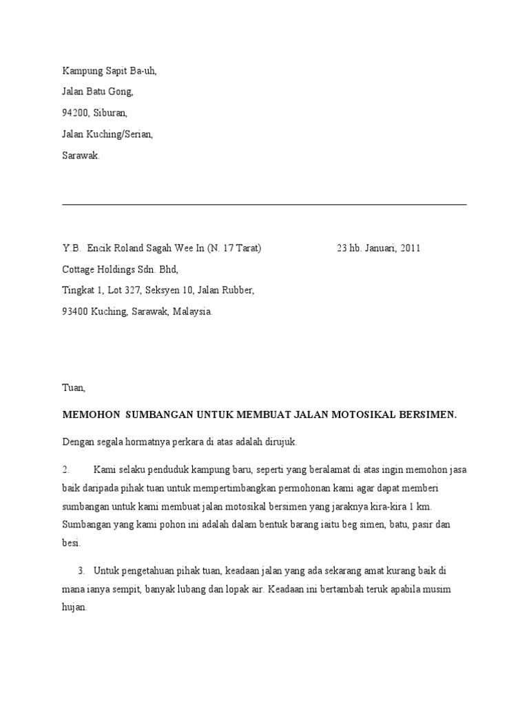 Surat Mohon Bantuan Baik Pulih Atap Dan Siling Rumah Docx Zenah Binti Harun No A 29 Kampung Cegar 35500 Bidor Perak Darul Ridzuan Tarikh 09 November Course Hero from www.coursehero.com Cara membuat surat permohonan pada dasarnya sama dengan cara membuat surat resmi lainnya. Format yang digunakan adalah surat rasmi,perlunya ketelitian didalam susunan tata. Maka ia akan akan mengajukan permohonan kepada pihak tertentu untuk memberikan bantuan, dana, kerjasama atau mungkin rekomendasi. Pengertian surat resmi merupakan sebuah surat yang digunakan sebagai tujuan resmi, terlepas dari apakah itu perorangan, agensi atau organisasi. Dari sini bisa kita simpulkan jika surat permohonan itu merupakan surat yang dibuat dengan tujuan untuk meminta bantuan, permohonan izin. Tidak ada aturan baku selain pemohon yang menandatangani contoh surat permohonan bantuan dana ini. Contoh surat permohonan bantuan baznas. Barangkali anda sedang mencari cara menulis surat.