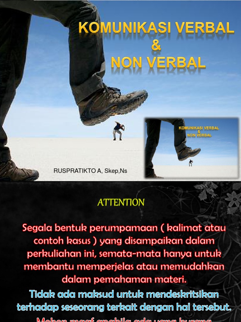For more information and source, see on this link : 7% pernyataan verbal, 38% bentuk vokal, 55% ekspresi wajah. Kesantunan verbal ⇨kesantunan berbahasa daripada segi verbal merujuk kepada percakapan, lisan dan pertuturan. Egan (1994) • merupakan semua bentuk rangsangan (kecuali verbal) yang terdapat dalam suatu set. Kesantunan bukan verbal merupakan bahasa komunikasi bukan lisan yang melibatkan isyarat tangan, air muka dan gerakan badan.