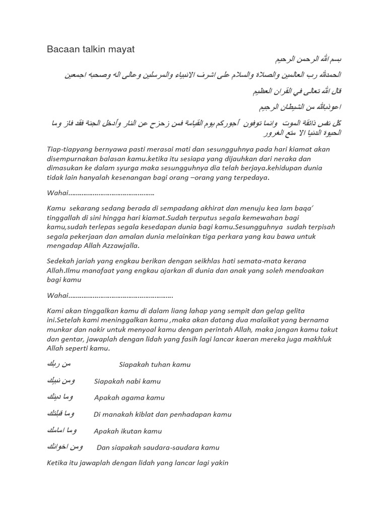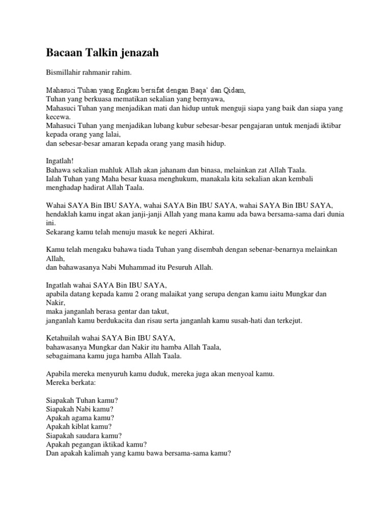 Related : Bacaan Talkin Jakim Pdf / Pdf A Hasyimi M Alatas Salat Jenazah Talqin Mayit Ziarah Kubur Tahlil Pdf Wirlilik Gundoyo Academia Edu / Maha suci tuhan yang engkau bersifat dengan baqa dan qidam tuhan yang berkuasa mematikan sekalian yang bernyawa maha suci tuhan yang menjadikan mat dan hidup untuk menguji siapa yang baik dan siapa yang kecewa maha..